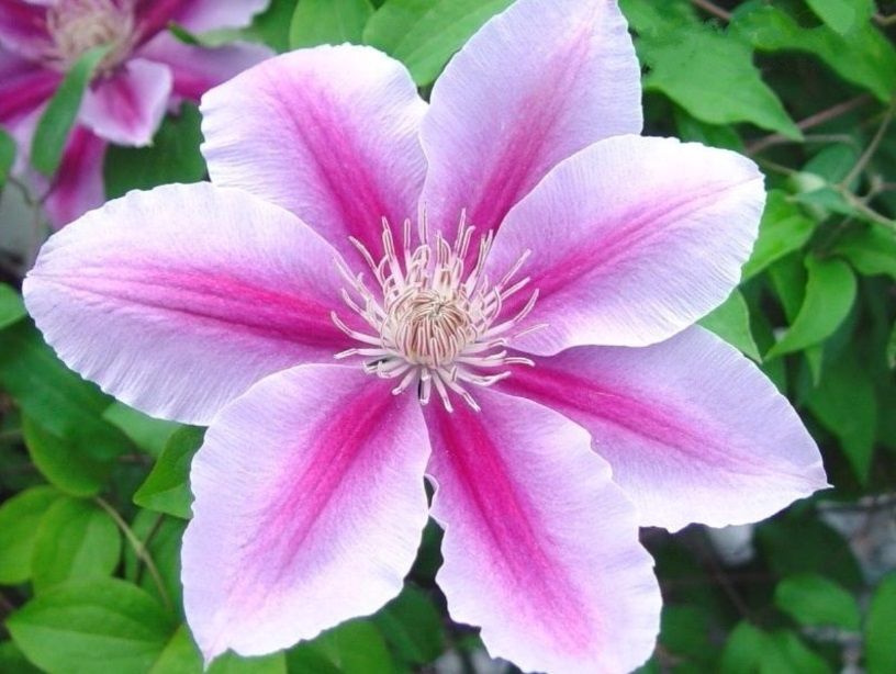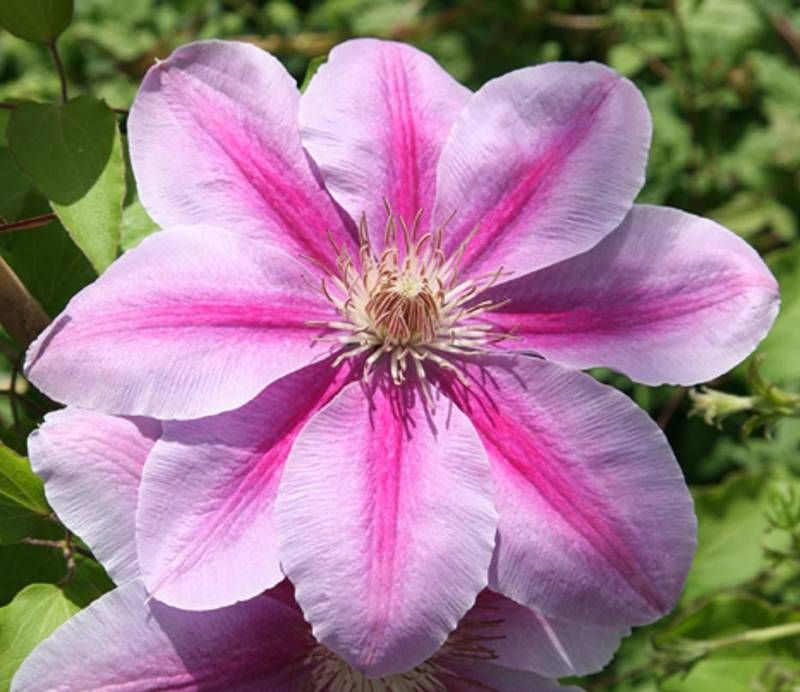 Клематис Биз Джубили (Bees Jubilee) – это изысканный многолетний вьющийся кустарник, который станет настоящим украшением вашего сада. Его крупные, до 16-18 см в диаметре, цветы привлекают внимание нежными розово-лиловыми лепестками с яркой малиновой полосой по центру. Цветение начинается в мае и продолжается до конца лета, радуя глаз своей продолжительностью и обилием.